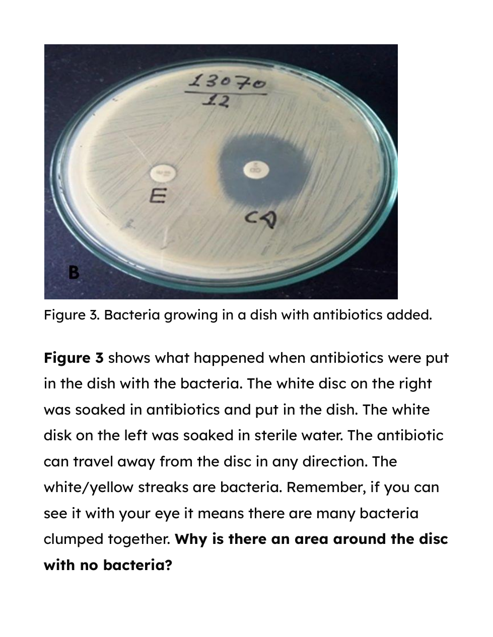 How are the bacteria colonies that are now growing near the antibiotic disc different from the bacteria that were killed by the antibiotic?