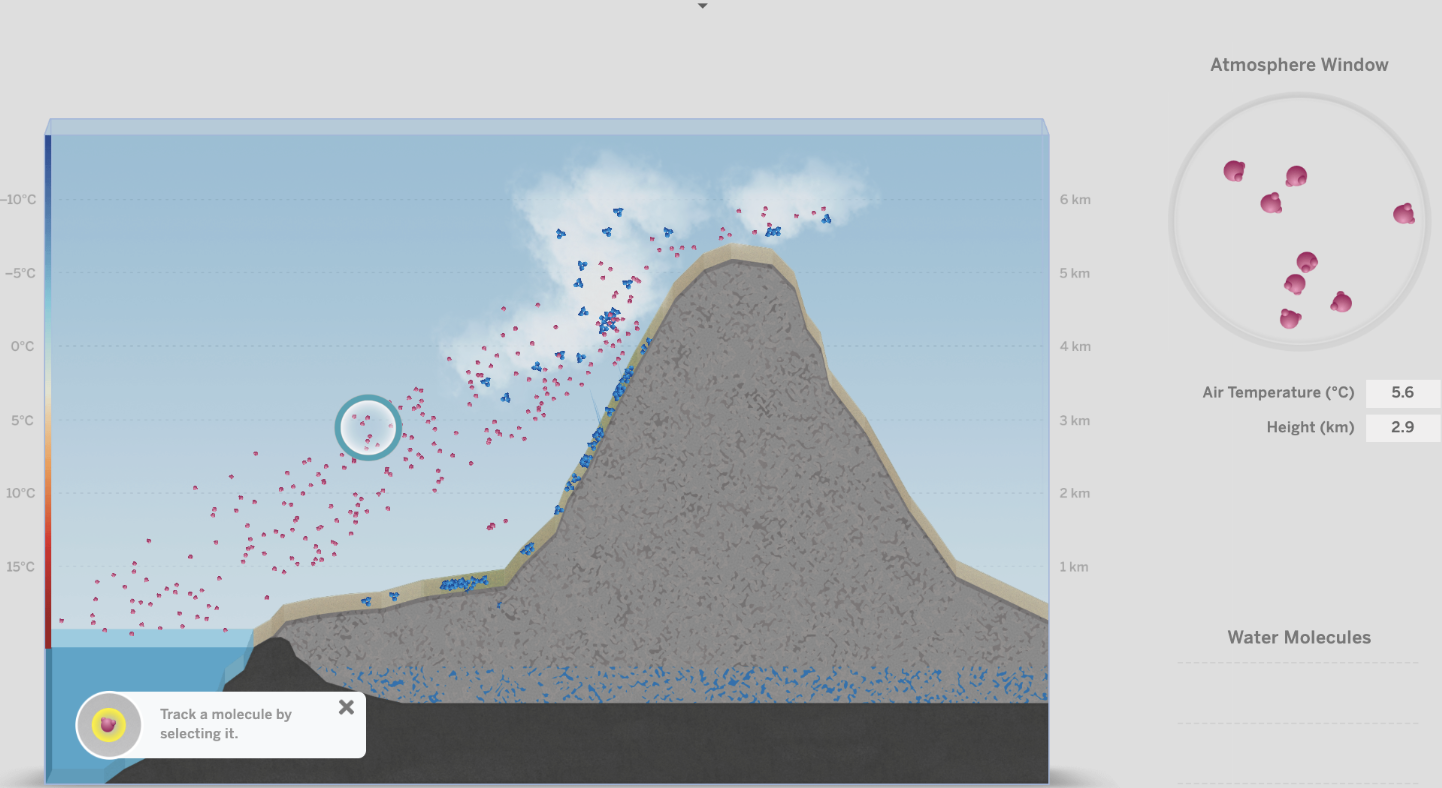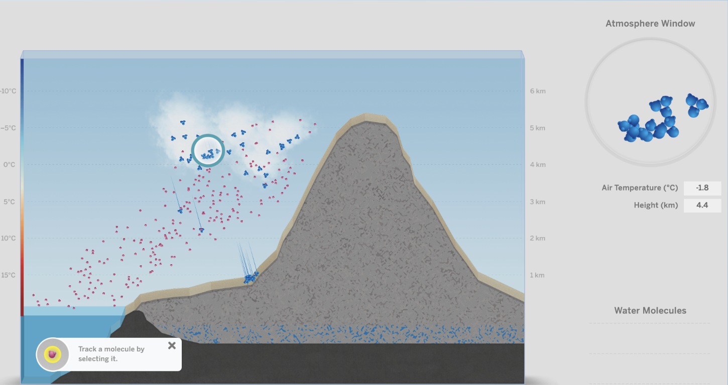 TASK 1: Select a water molecule that has formed part of a raindrop (blue). Observe the path of the molecule as you use the slider to scroll back and forth in time. Pay close attention to what happens as the molecules condense to form raindrops.