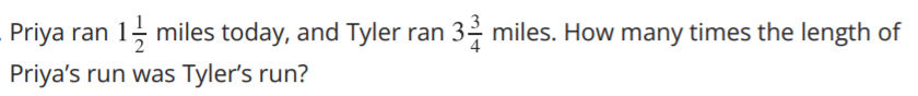 Priya ran 1 1/2 miles today, and Tyler ran 3 3/4 miles. How many times the length of Priya's run was Tylers's run?