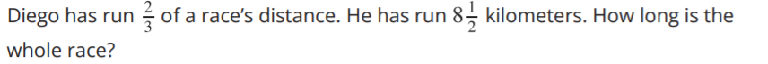 Diego has run 2/3 of a race's distance. He has run 8 1/2 kilometers. How long is the whole race?