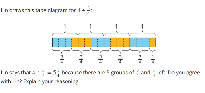 Lin draws this tape diagam for 4 divided by 3/4. Lin says that 4 divided by 3/4 equals 5 1/4 because there are 5 groups of 3/4 and 1/4 left. Do you agree with Lin? Explain your reasoning.