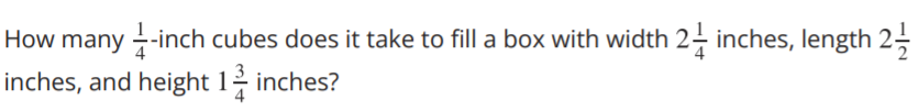 How many 1/4 inch cubes does it take to fill a box with a width of 2 1/4 inches, length 2 1/2 inches, and height 1 3/4 inches?