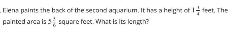 Elena has two aquariums, each shaped like a rectangular prism. For each question, explain or show your reasoning. Elena paints the back of the second aquarium. It has a height of 1 3/4 feet. The painted area is 5 5/6 square feet. What is its length?