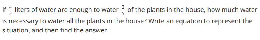 If 4/3 liters of water are enough to water 2/5 of the plants in the house, how much water is necessary to water all the plants in the house? Write an equation to represent the situation, and then find the answer.
