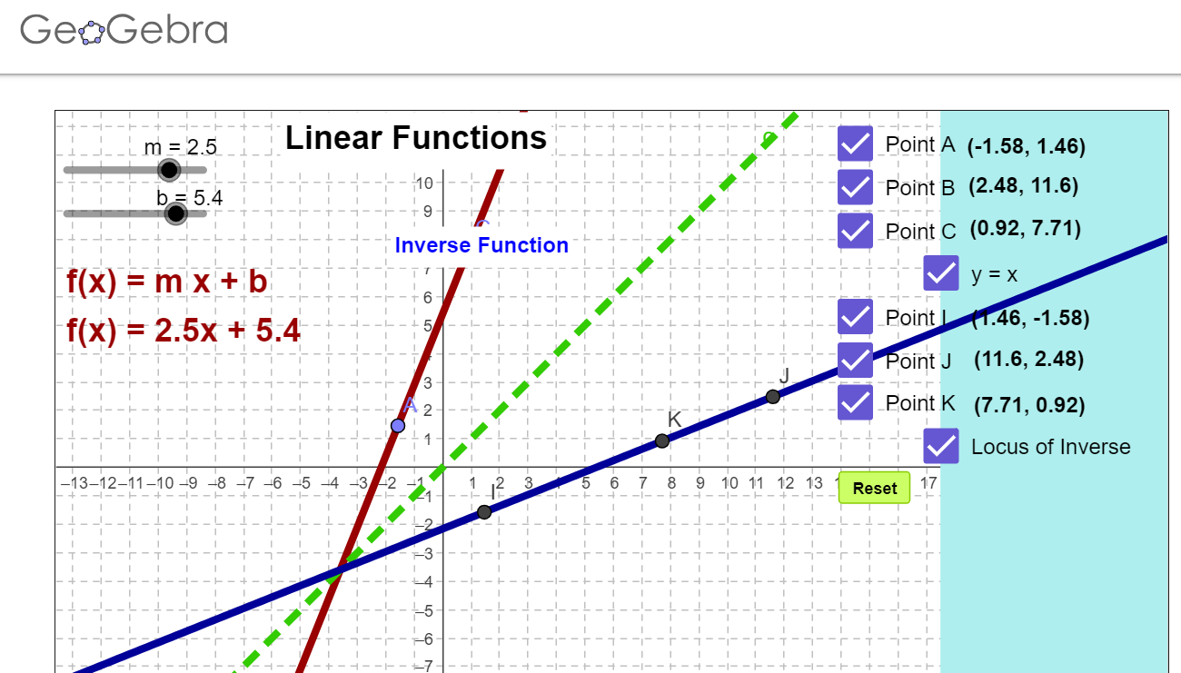 Adjust the slider for m (the slope) and b (the y-intercept)- and observe a line and its inverse.