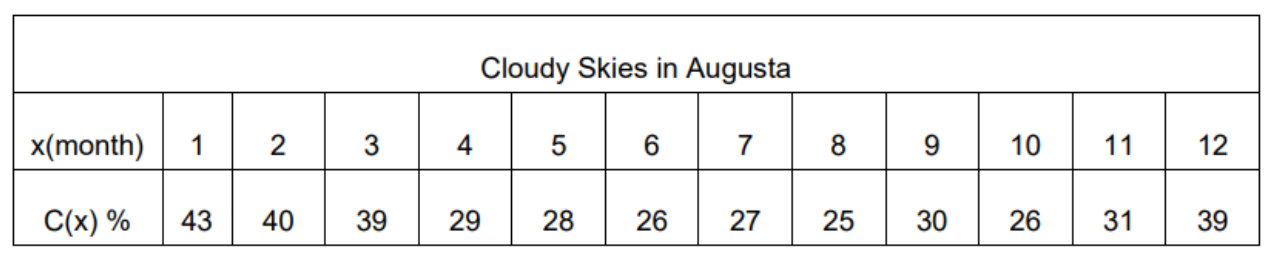 The table below represents a function C that computes the percentage of the time that the sky is cloudy in Augusta, Georgia, where x corresponds to the standard numbers for the months.