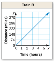The distance y (in miles) that Train A travels in x hours is represented by the equation y = 76x.