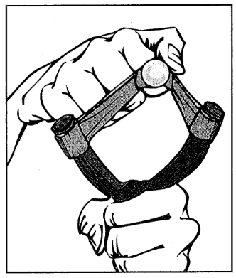 A slingshot below is made with wood and a rubber band. When a ball is placed in the slingshot and the rubber band is pulled, it forces the ball outward.