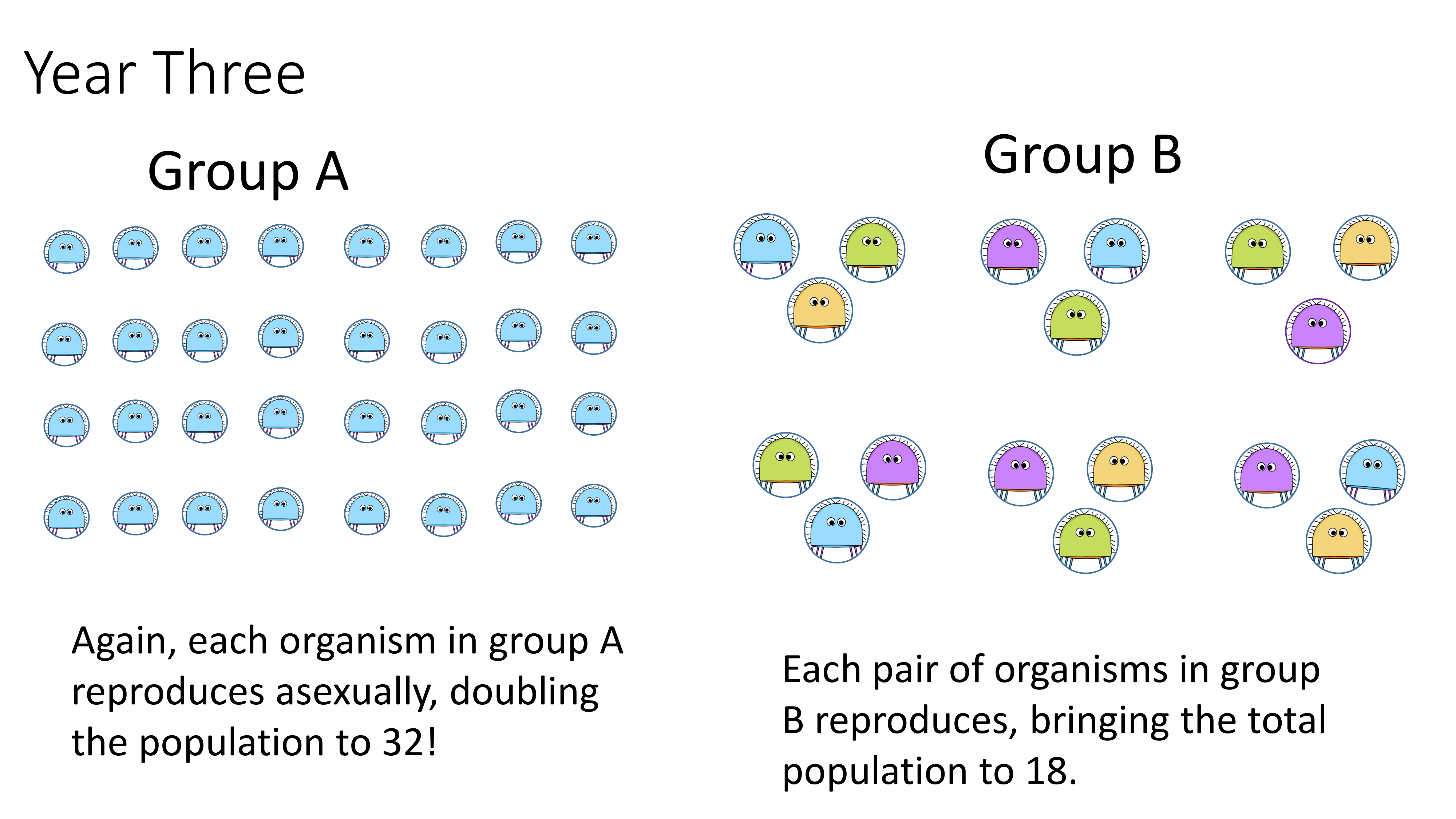 Group B started with 12 individuals. How many new offspring were born during year 3?