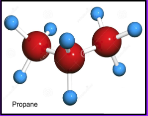 The molecule below represents propane. The red atoms are carbon and the blue atoms are hydrogen. There are no hidden atoms.