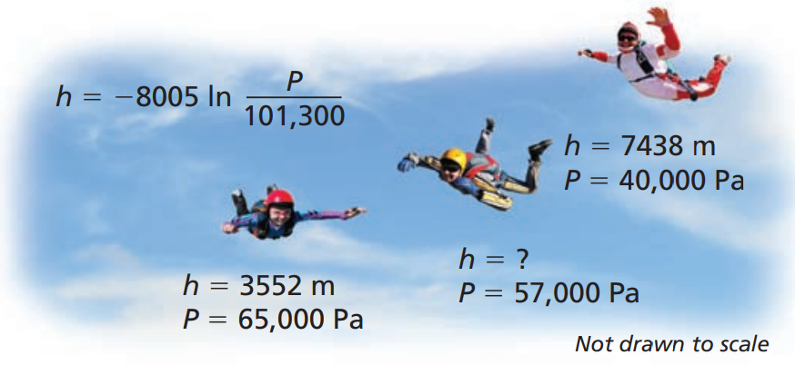 Skydivers use an altimeter to track their altitudes as they fall. The altimeter determines altitude by measuring air pressure. The altitude h (in meters) above sea level is related to the air pressure P (in pascals) by the function shown in the diagram. What is the altitude above sea level when the air pressure is 57,000 pascals? (Round your answer to the nearest hundredths.)