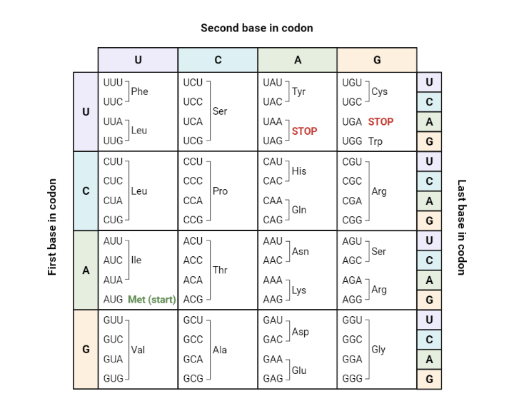 Biologists use a codon chart or a codon wheel to determine the amino acids. Amino acids are usually abbreviated on these charts as three letter words, like Cys and Ser.