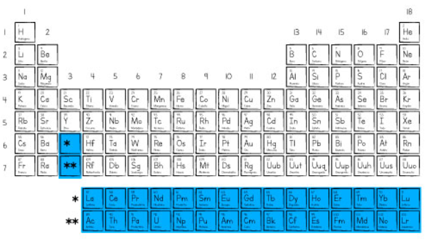De acuerdo a la siguiente imagen. Los asteriscos dirigen a la parte inferior de la tabla periódica, ¿qué tipo de elementos están ahí?