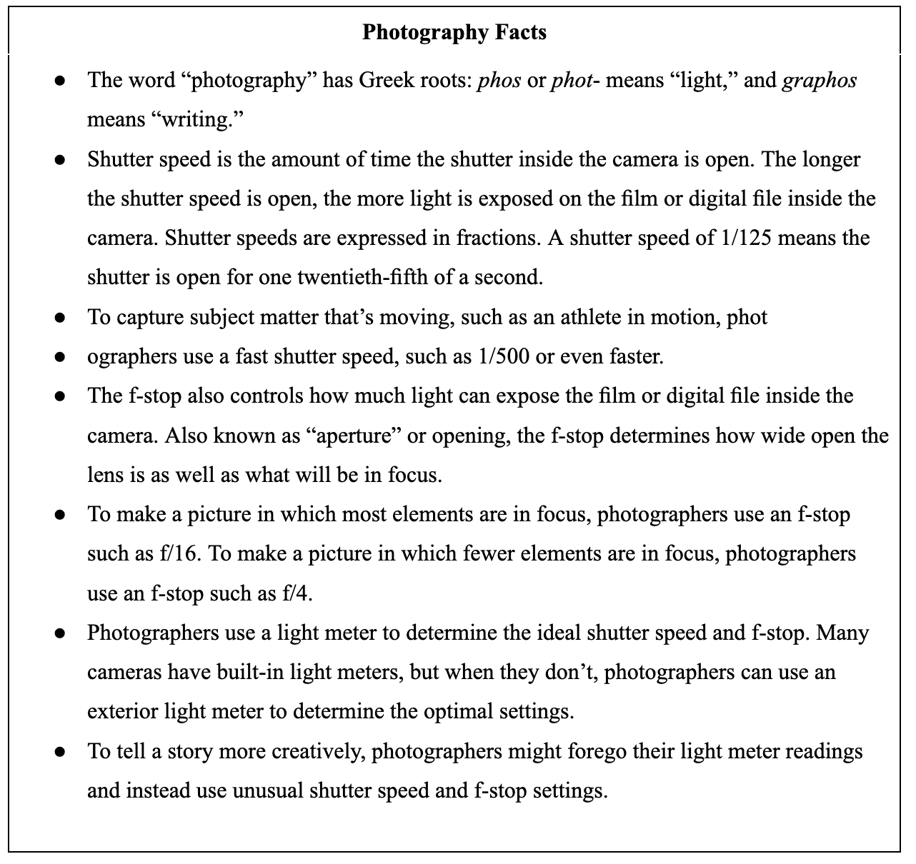 Which of the following from the text in the box titled “Photography Facts” supports one of the themes in the passage?