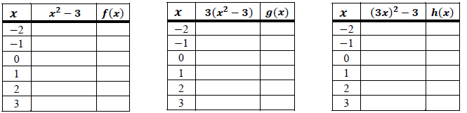 The quadratic function {𝒇(𝒙)=𝒙^πŸβˆ’πŸ‘} undergoes two different dilations, creating {π’ˆ(x)}and {𝒉(𝒙)}, as shown below.