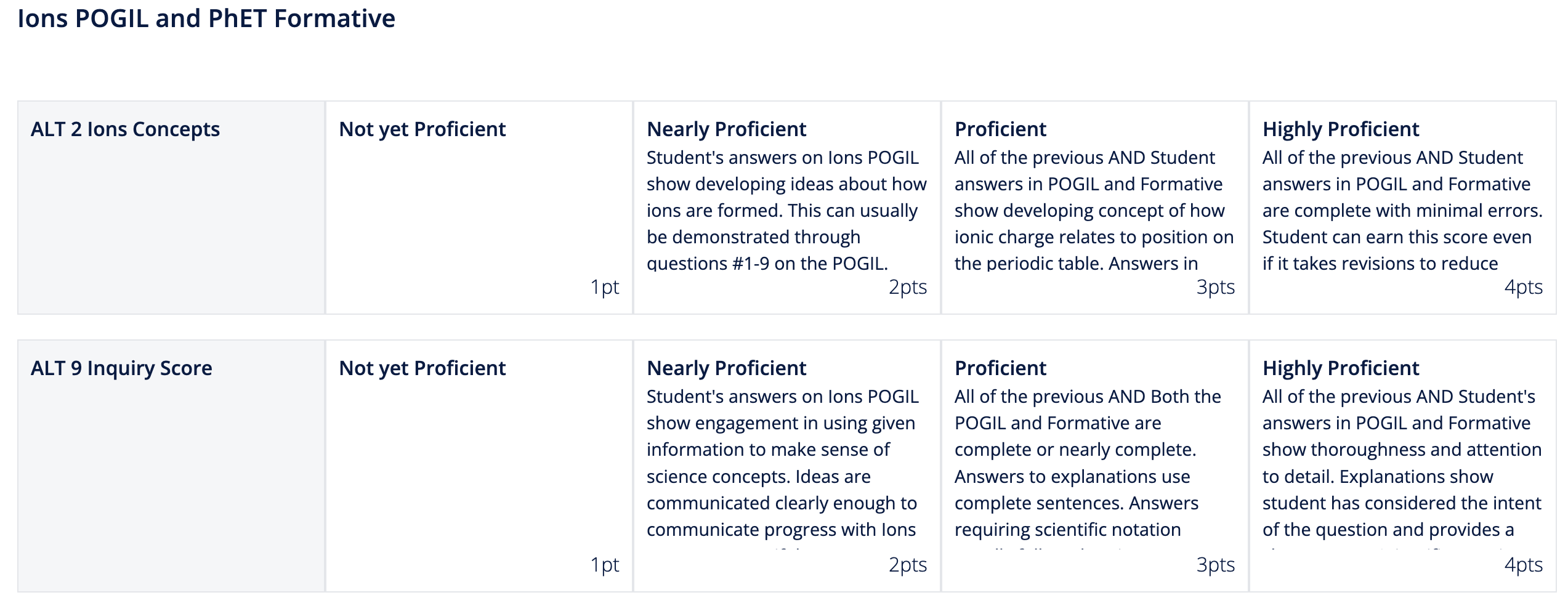 Your individual work on this Formative will be considered along with the Ions POGIL on this graded inquiry assignment. You will be scored based on this rubric: