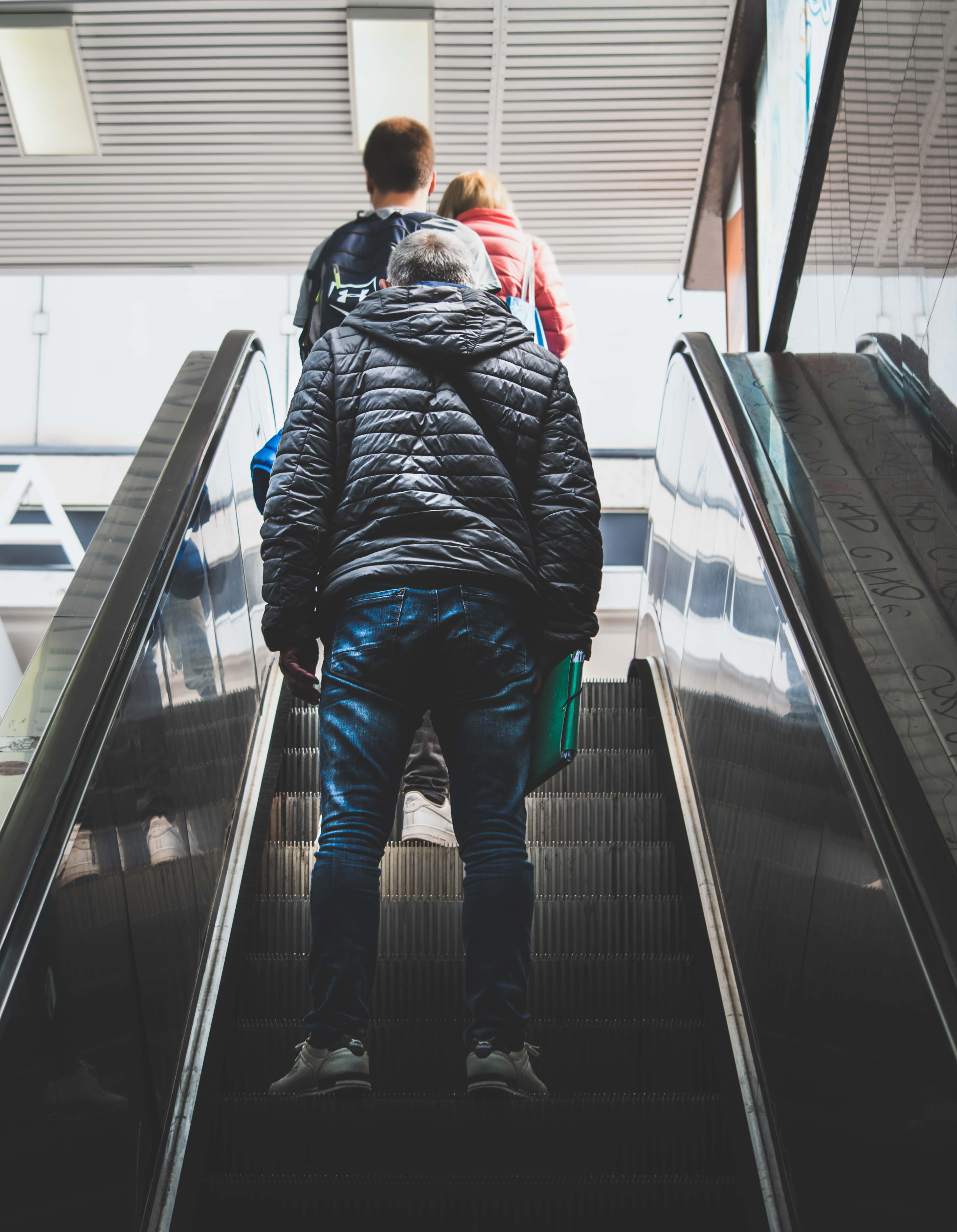 A 75.0-kg man is riding an escalator in a shopping mall. The escalator moves the man at a constant velocity from ground level to the floor above, a vertical height of 4.60 m. What is the work done on the man by the escalator?