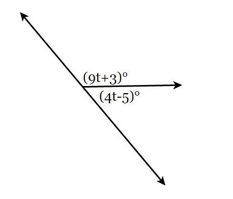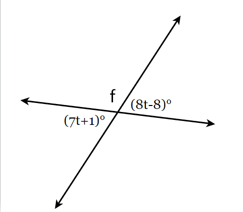 The figure shows two intersecting lines and measures of the resulting angles. Solve for t and for f.
