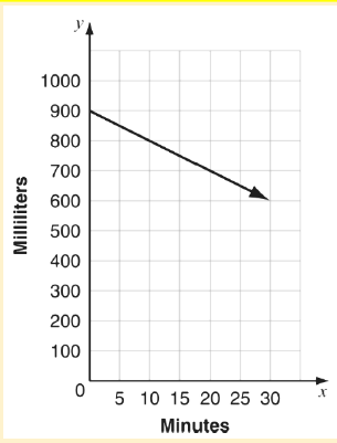 A liquid solution is slowly leaking from a container. The graph shows the milliliters of solution, y, remaining in the container after x minutes.
