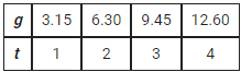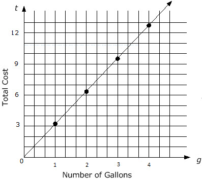 The price of gasoline is $3.15 per gallon. The graph below shows the pattern t = 3.15g, where t represents the total cost to fill up a gas tank, and g represents the number of gallons of gasoline bought.