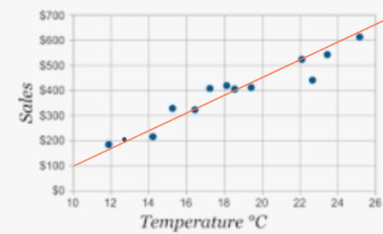 The scatterplot below compares the temperature and icream sales. The model represented in the scatterplot is y=12.5x+100.