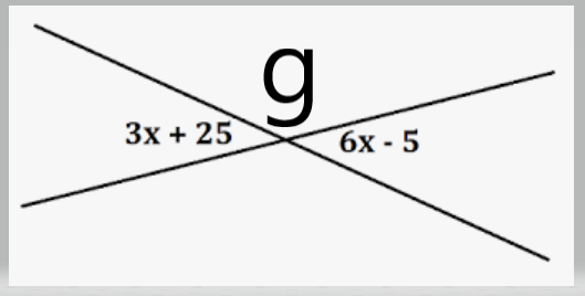 The figure shows two intersecting lines and measures of the resulting angles. Solve for x and for g.