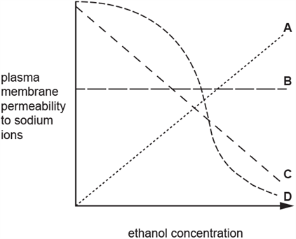 Which of the lines, A to D, in the graph represents the effect of increasing ethanol concentration on the permeability of the plasma membrane to sodium ions?