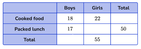 At Green High School a sample survey was conducted to see how many students preferred eating the cooked food at the cafeteria verse bringing their own packed lunch. The results were broken down by gender in the following two-way table.
