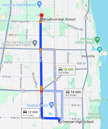 Calculate the average miles per hour to travel 4.4 miles from Tremper to Bradford High School in 12 minutes.