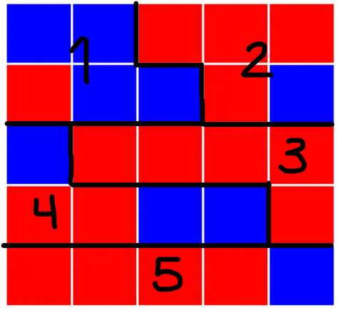 Consider the following district map with 5 districts. The red squares represent Party A voters, and the blue squares represent Party B voters. Each district has 5 voters.