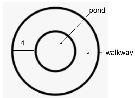 Keri is building a pond with a walkway around the pond. The pond is 40 ft wide.