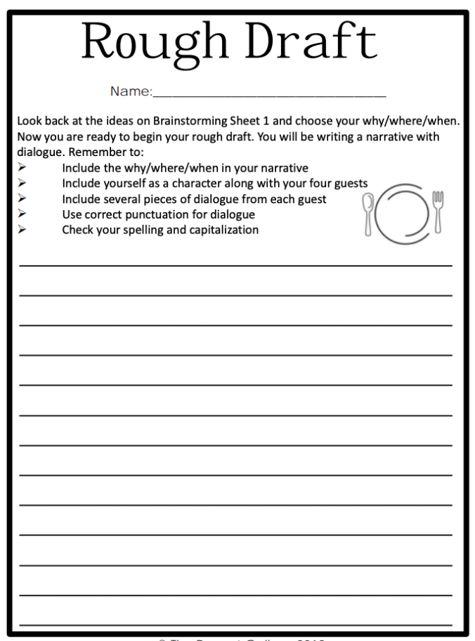 Using your brainstorming work, begin your rough draft. Remember to:1. Include why, where, and when2. Include yourself as a character along with 4 other guests.3. Include several pieces of dialogue from each guest4. Use correct punctuation for dialogue5. Check your spelling and capitalization