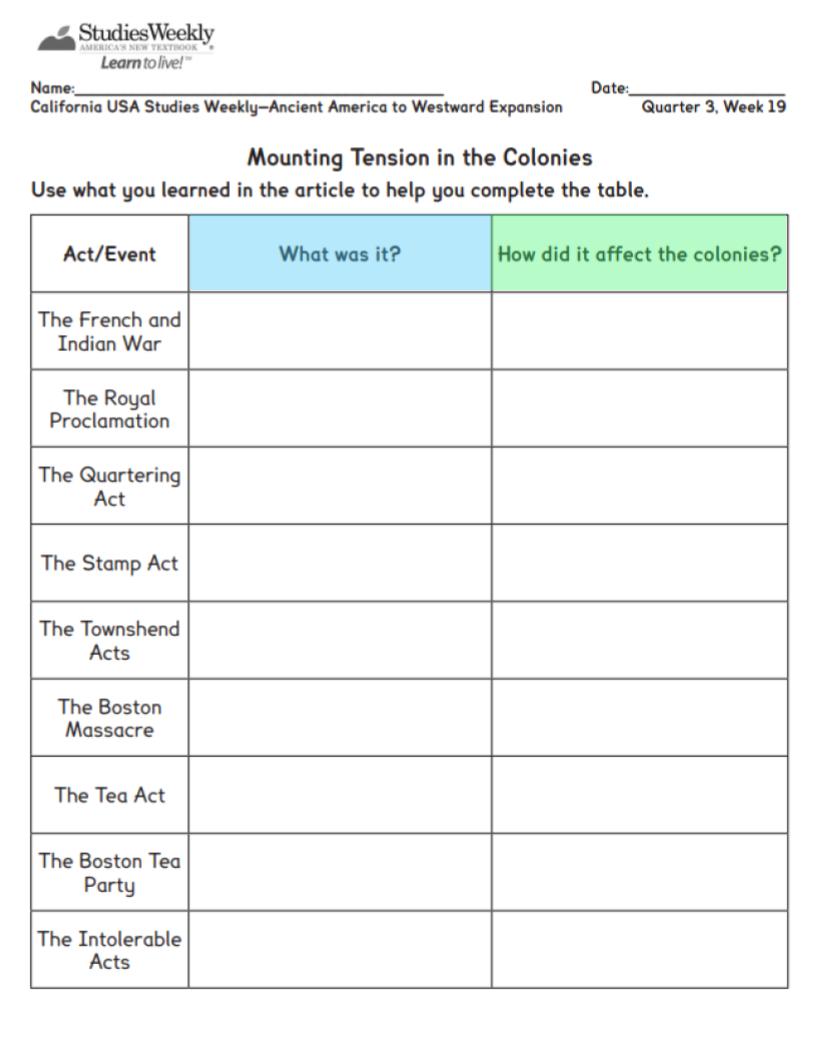 Complete the table below using your Week 19 Studies Weekly newspaper