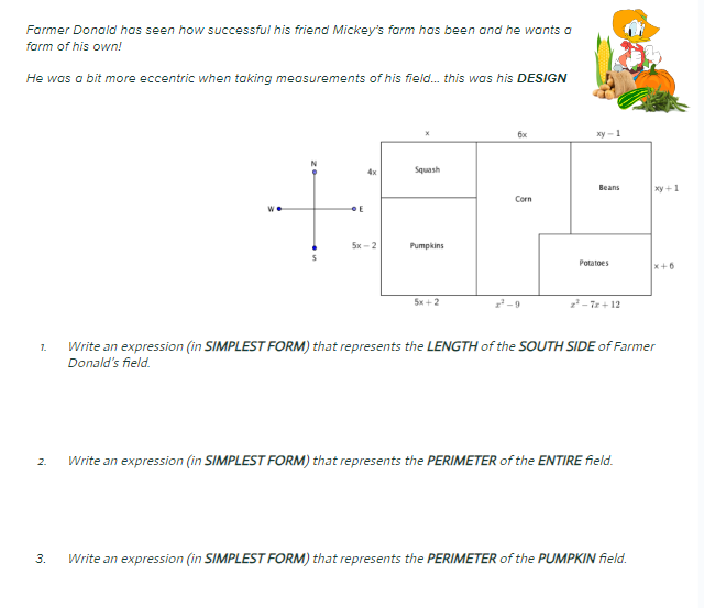 Use the "show your work" space to write AND simplify an expression that represents the LENGTH of the SOUTH side of the field.