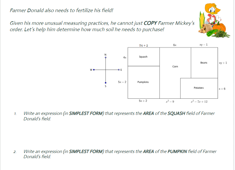 Use the "show your work" space to write AND simplify an expression that represents the AREA of the SQUASH side of the field.