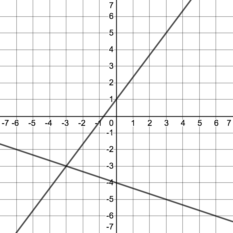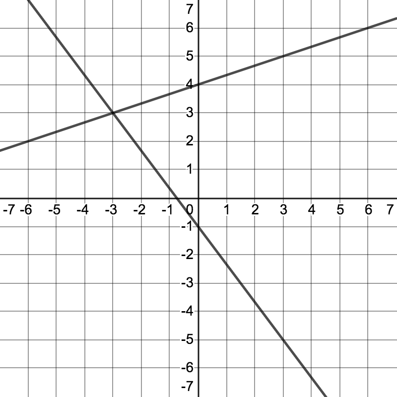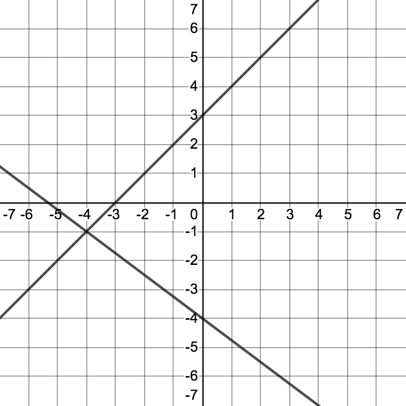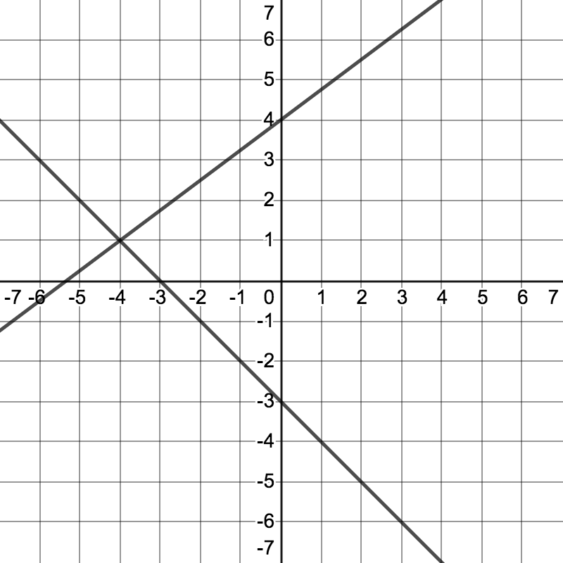 Which graph best represents this system of equations and it solution?4x + 3y = -3x - 3y = -12