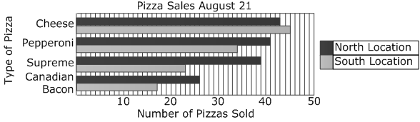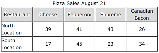 The owner of Pedro’s Pizza collected data on the types of pizza that was sold at his two restaurant locations on one day. The table below shows the results of this data.