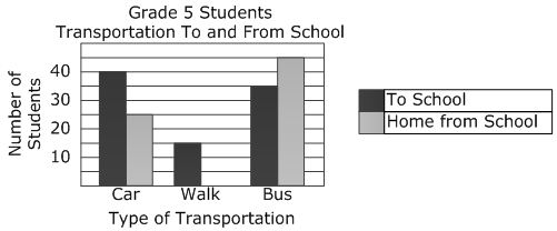 Toppenish Elementary collected data to determine how the Grade 5 students traveled to school and home from school. The data is shown in the graph below.