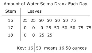 Selma recorded the amount of water, in ounces, that she drank each day during the last 20 days. Her results are shown in the stem-and-leaf plot below.