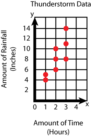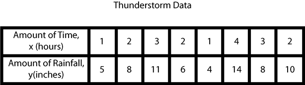 The table shows the amount of time eight thunderstorms lasted and the amount of rainfall each thunderstorm produced.