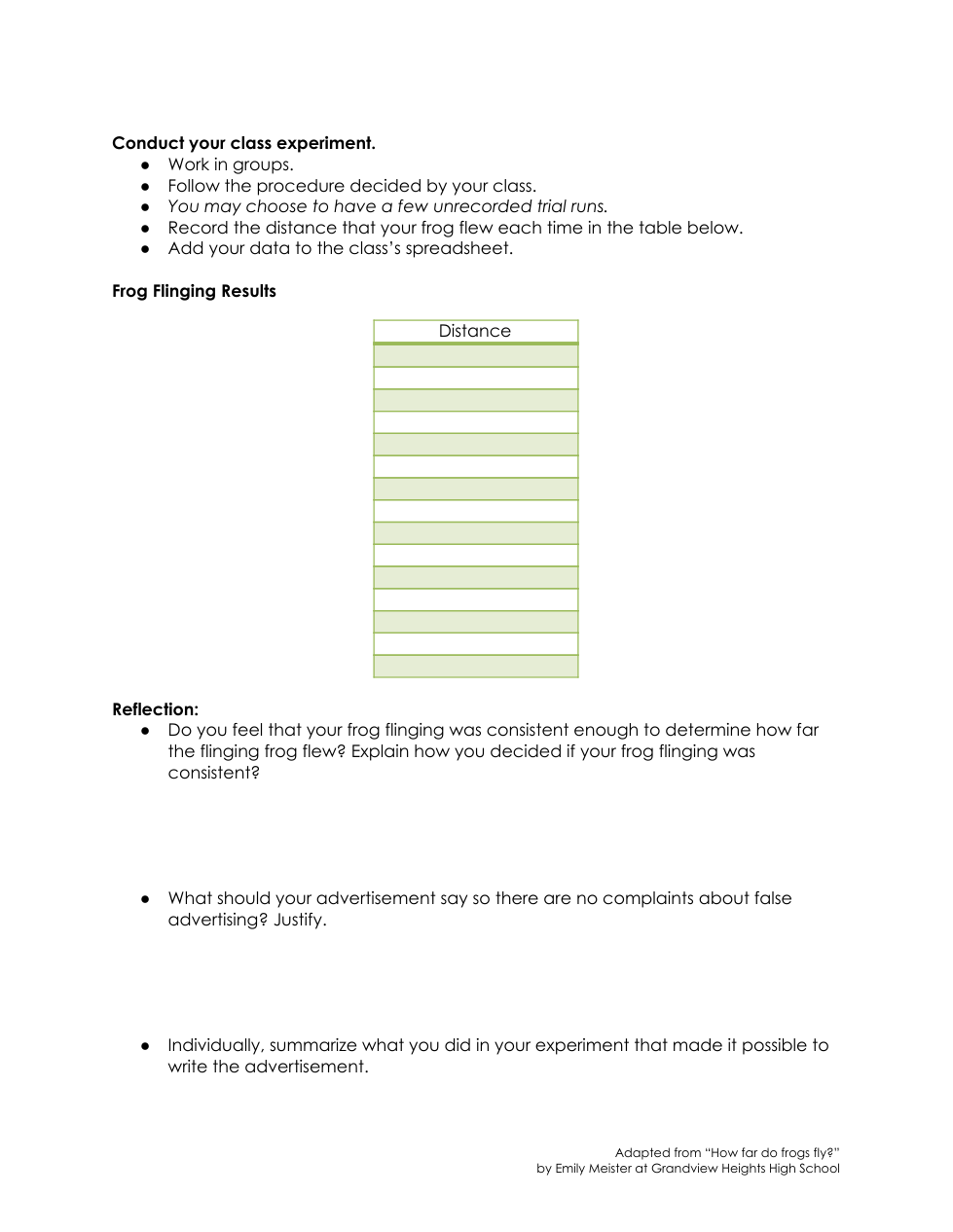 Enter your 10 distances in the following spreadsheet.Flinging Frog Distances