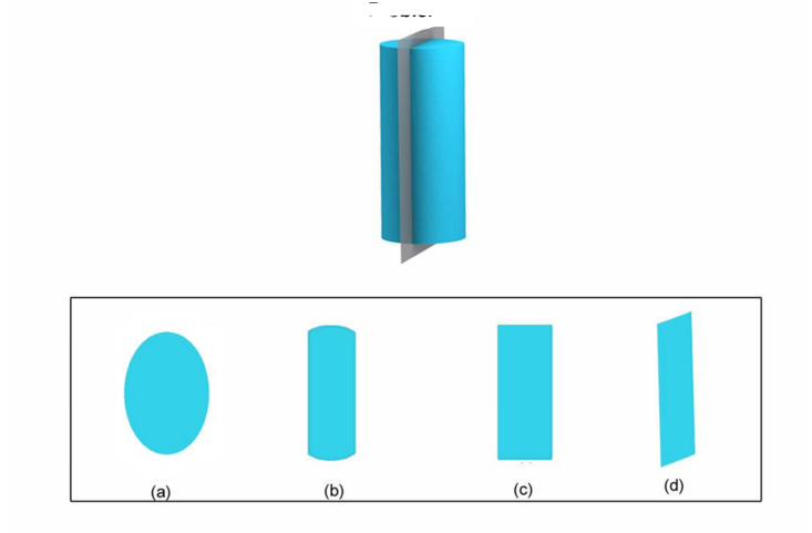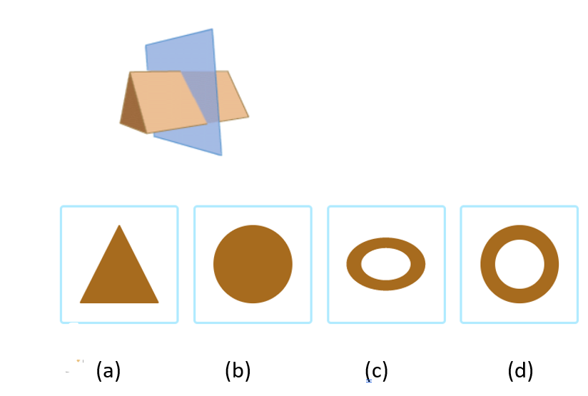 Select all of the shapes of the cross sections that could result from slicing the figure as described in the table below.