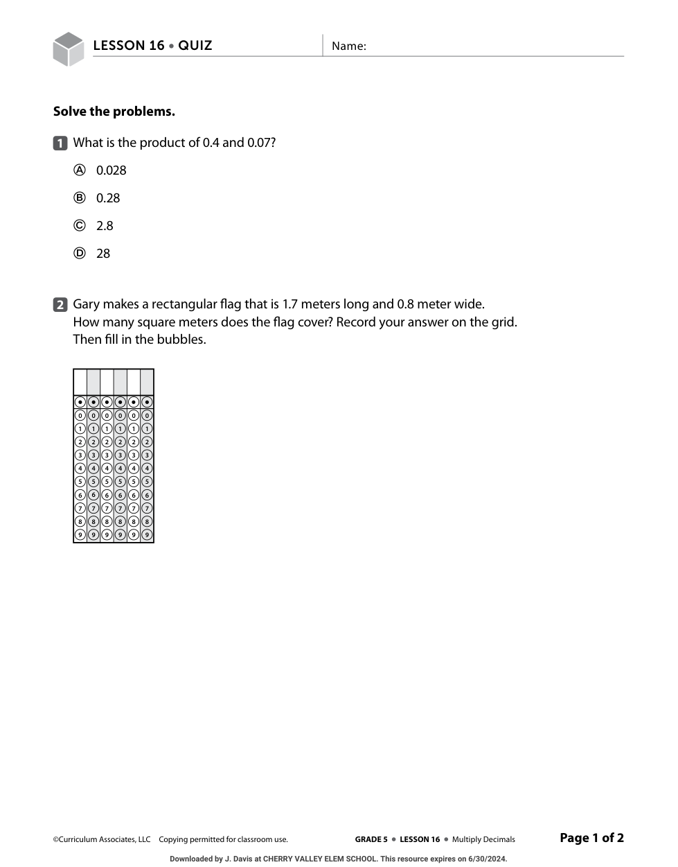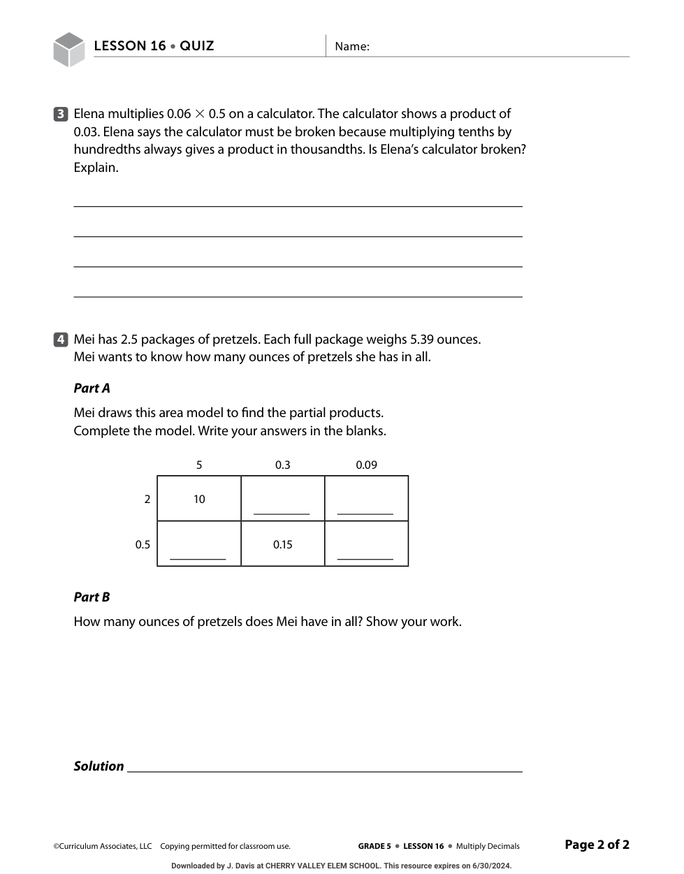 Elena multiplies 0.06 and 0.5 on a calculator. The calculator shows a product of 0.03. Elena says the calculator must be broken because multiplying tenths by hundredths always gives product in thousandths.