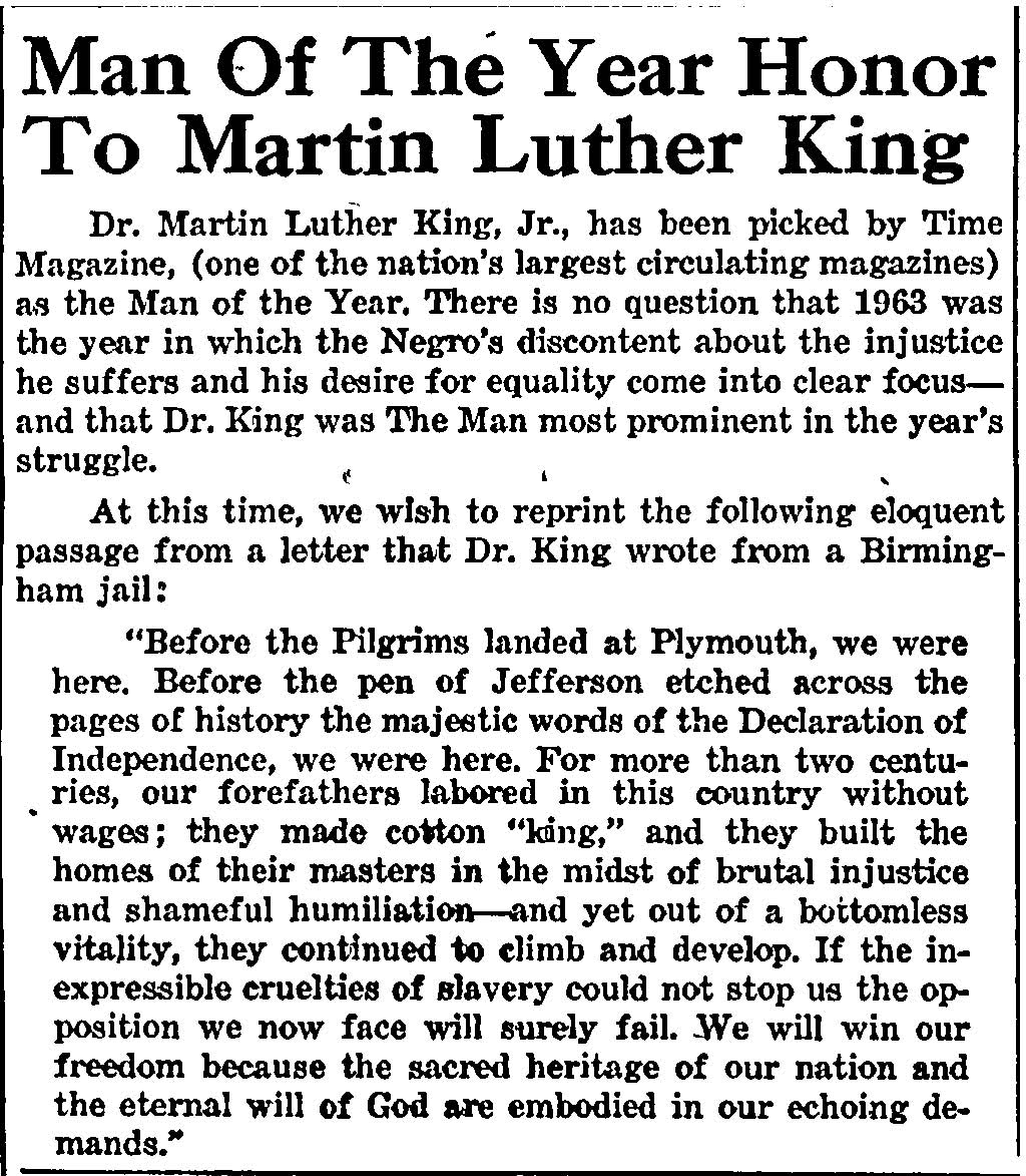 What is the reason the article gives for MLK being chosen as Time Magazine's Man of the Year?