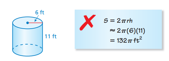 Jane solved the problem below for the surface area of the cylinder. Her solution is not quite correct. Explain what her mistake was and solve the problem correctly.