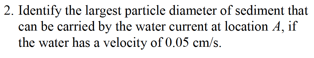 Identify the largest particle diameter that can be carried if the water has a velocity of 0.05 cm/s?