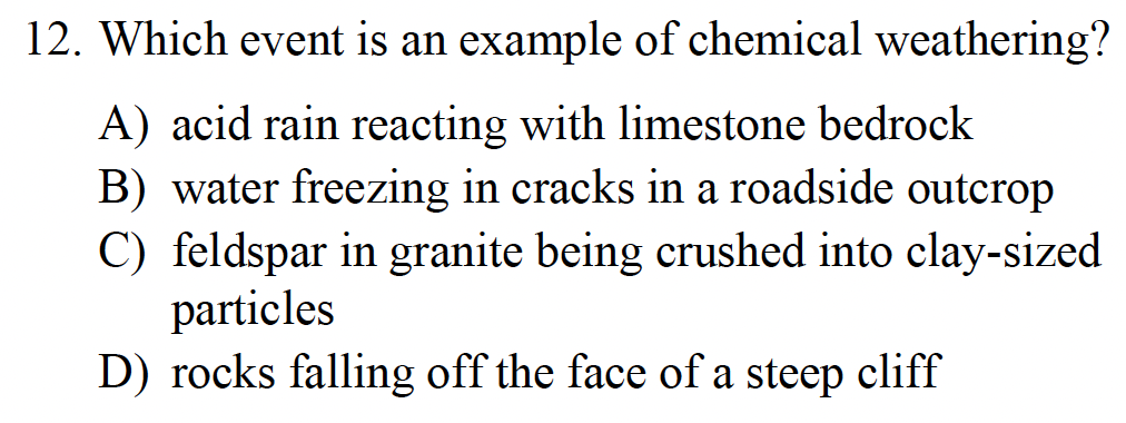 Chemical weathering | arrow_right_alt | Breaks rocks into smaller pieces without changing their composition. |