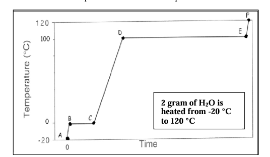 Using the above image of a heating curve for water, the line segment between B and C is a __________ , the line segment between C and D is a __________ , and the line segment from D to E is a __________. Overall, this graph represents water changing from __________