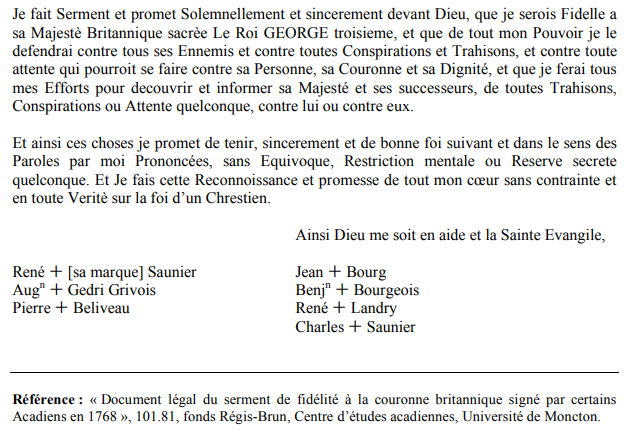 Serment d'allégeance au Roi d'Angleterre refusé par la plupart des Acadiens