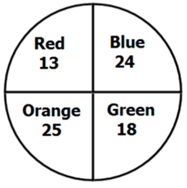 A fair spinner was spun 150 times and the results are shown below. Each section was equally likely to be landed on. For which color on the spinner was the experimental probability furthest from the theoretical probability?